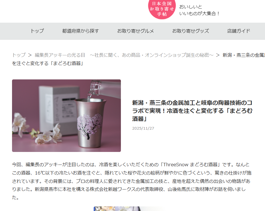日本各地の中小企業の隠れた名品を紹介するWEBメディア『日本全国お取り寄せ手帖』に当社社長とまどろむ酒器について取材、掲載いただきました。