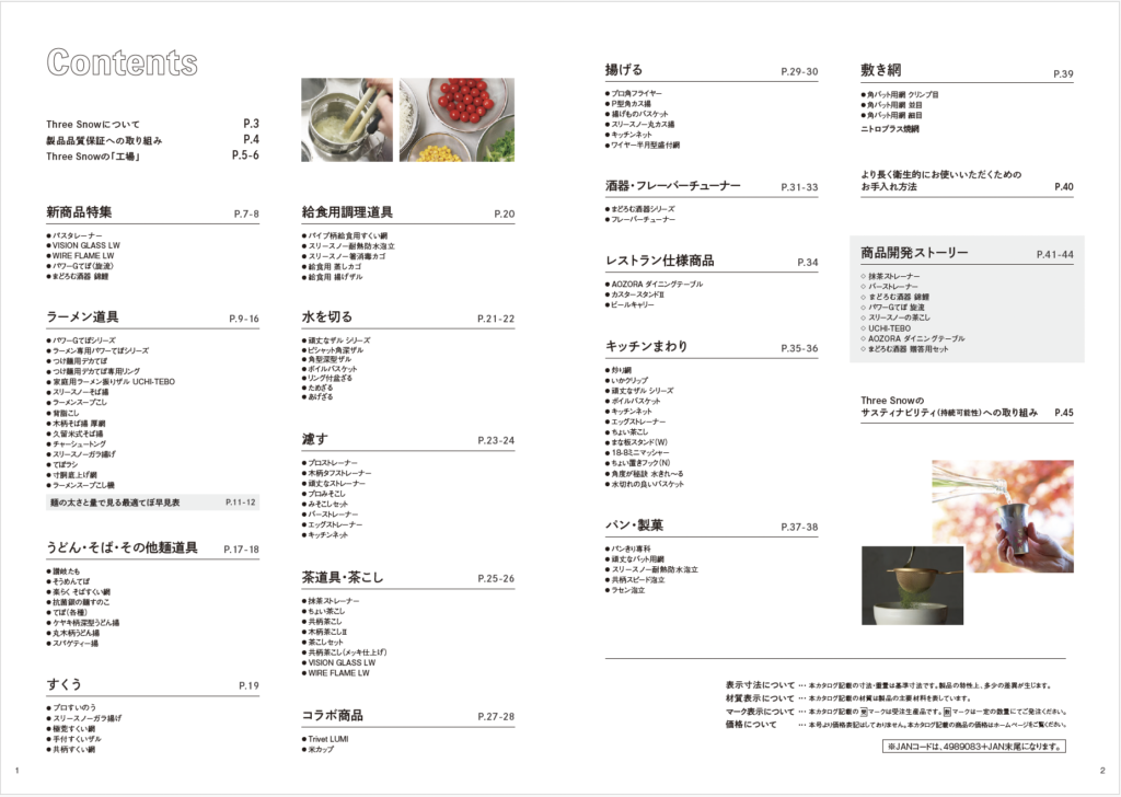このたびThreeSnowの新カタログvol.9が発刊となりました。新商品はもちろんのこと、読み物としての開発ストーリーや品質についてのこだわりなど、ぜひ今の私たちを知っていただくきっかけになれば幸いでございます。全国へお届けいたしますのでご希望の方は弊社までご一報いただくか、お近くの販売店等にてお求めくださいませ。