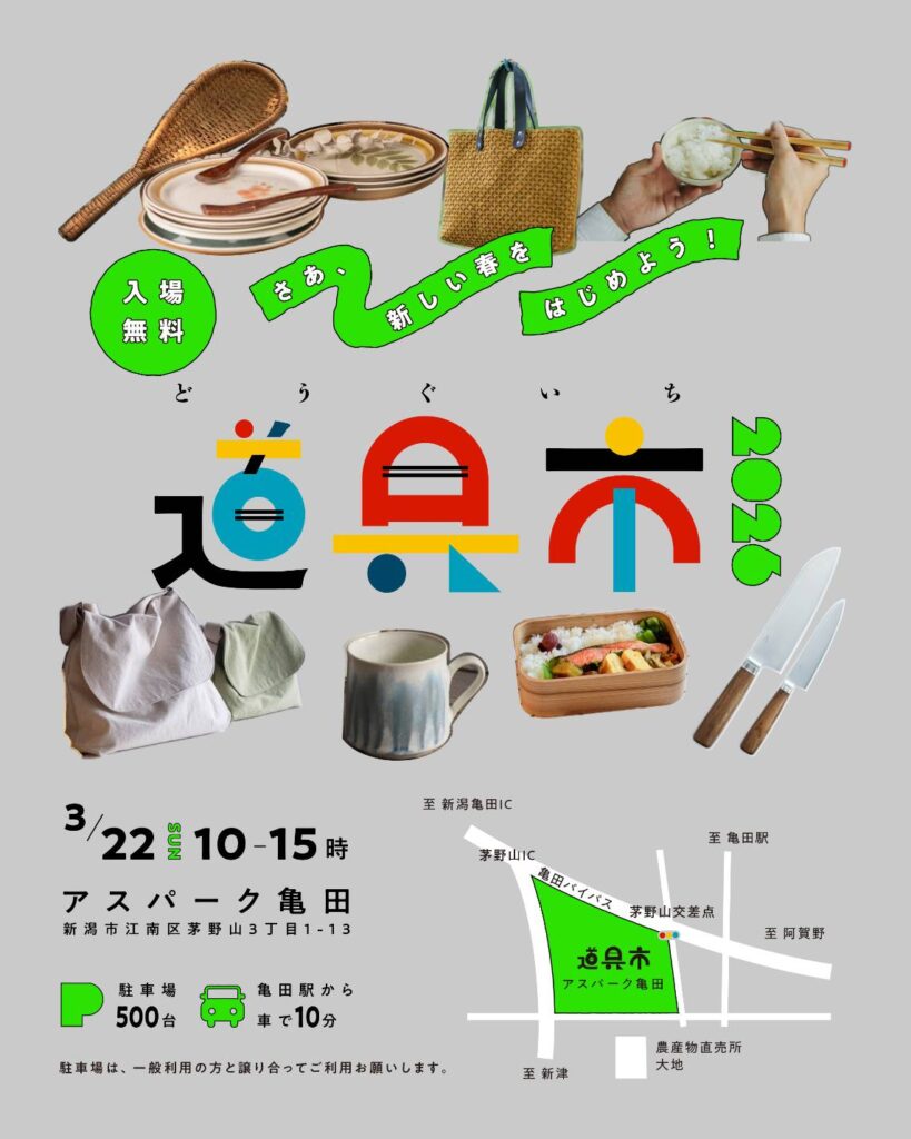 3月22日(日)10:00~15:00、アスパーク亀田で開催される道具市2026に出店いたします!