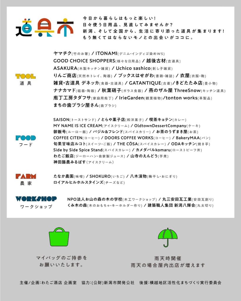 今年も新潟、全国から生活に寄り添った道具が集まります。フードを楽しみながらワークショップも参加できます!まもなくやってくる春の訪れ、新しい暮らしをちょっと楽しくする道具たちが目白押しです。今年の暮らしの相棒を見つけに来てください。