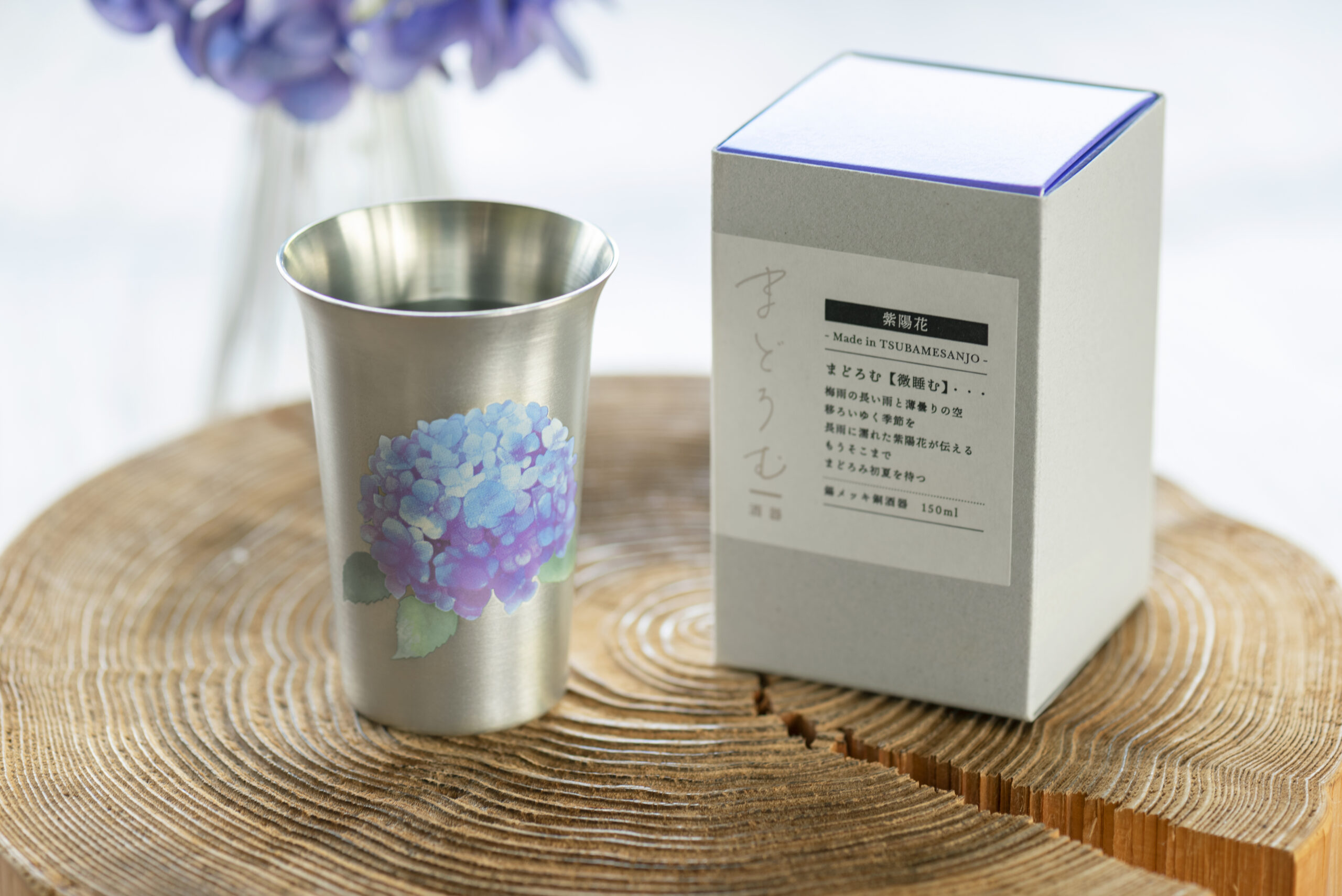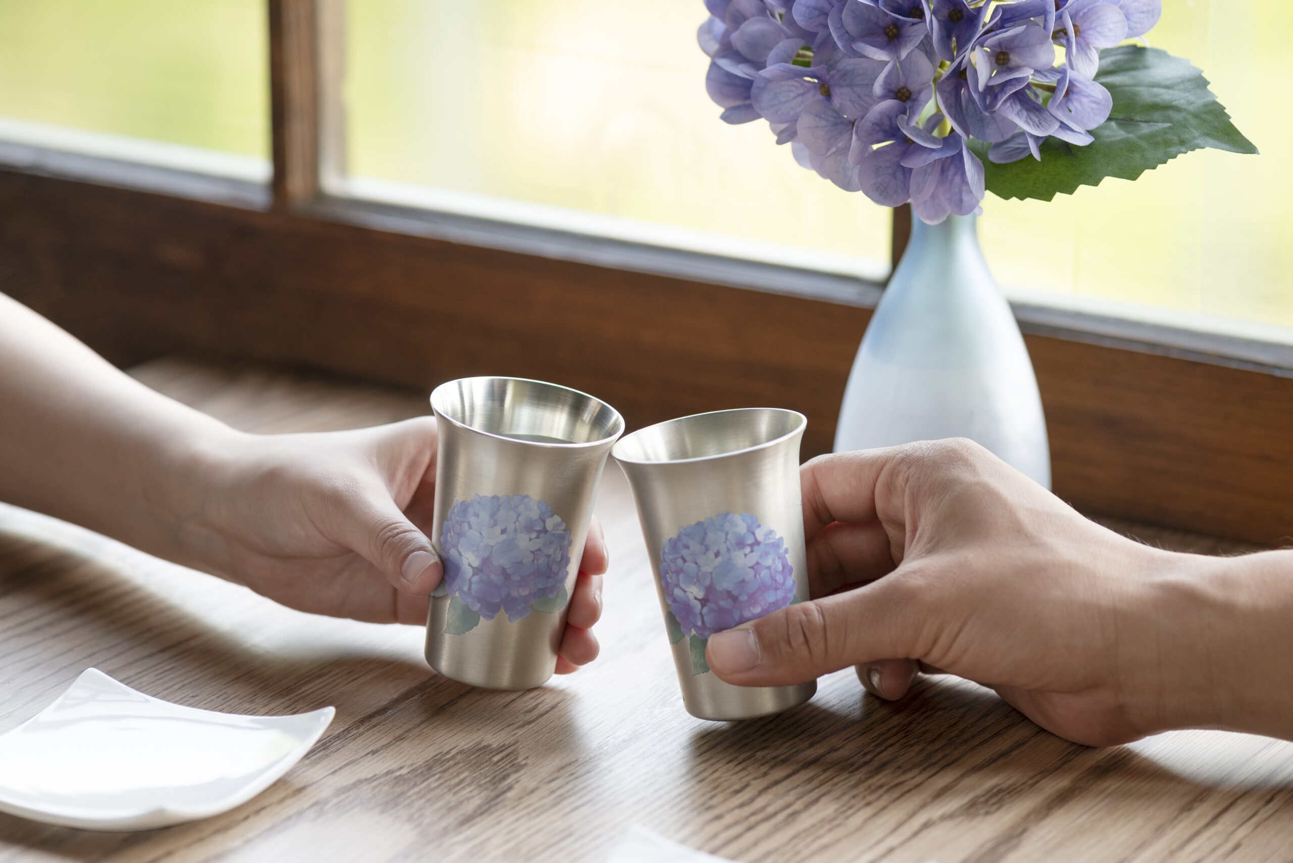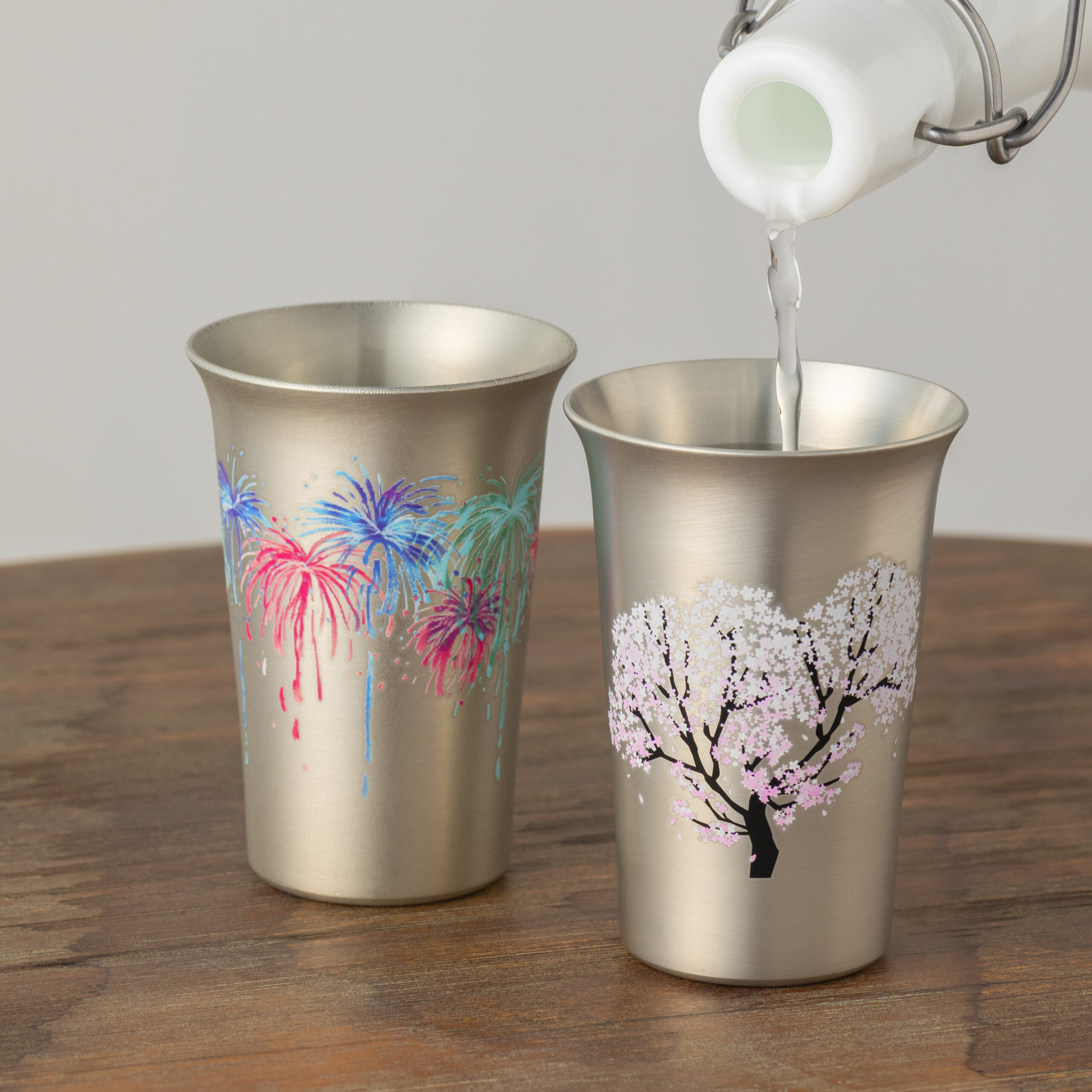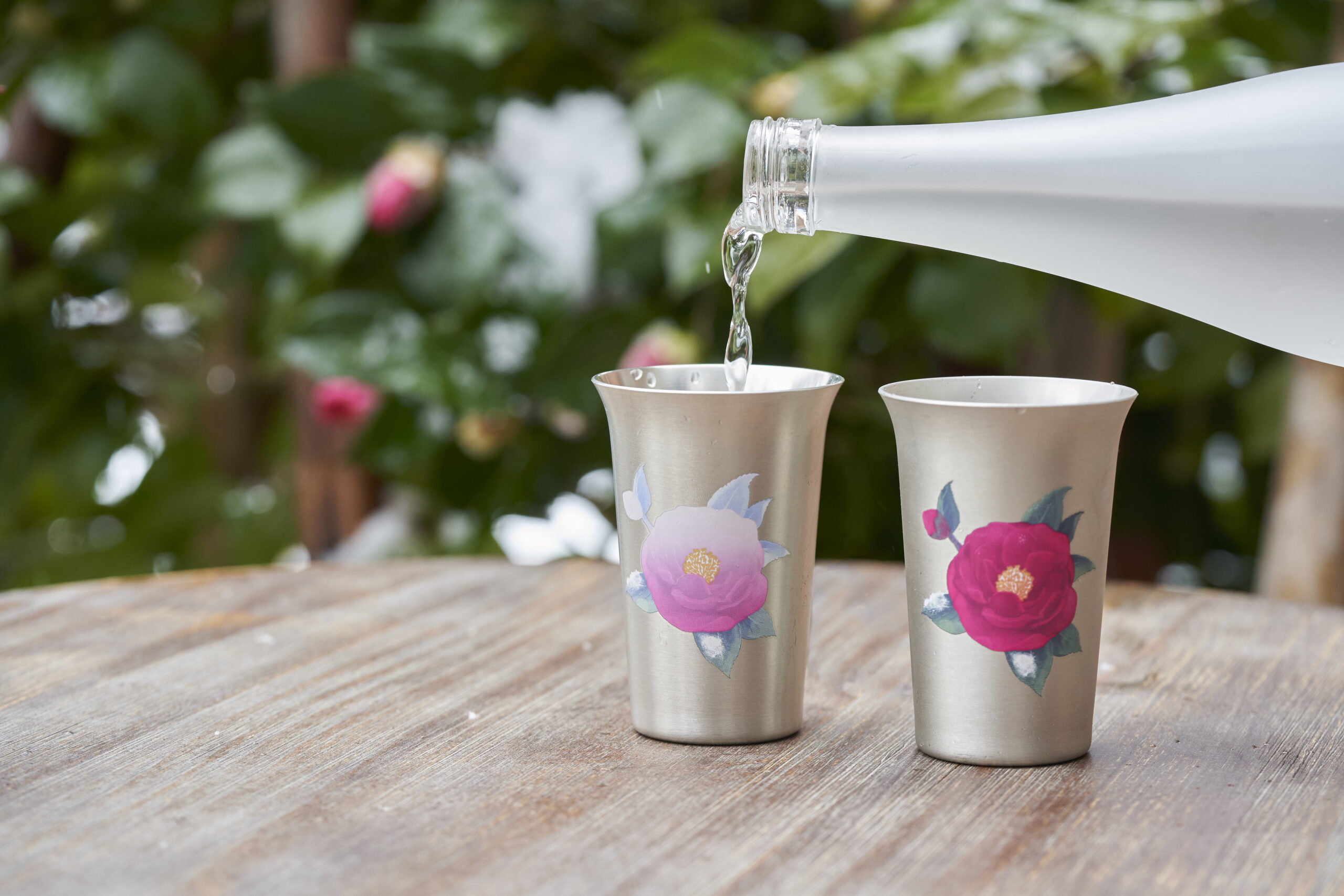 銅に錫でコーティングされた金属製の酒器。表面には季節を感じる様々な柄を施し、およそ16℃以下の冷たい液体を入れると柄が色づく仕掛けの酒器です。
