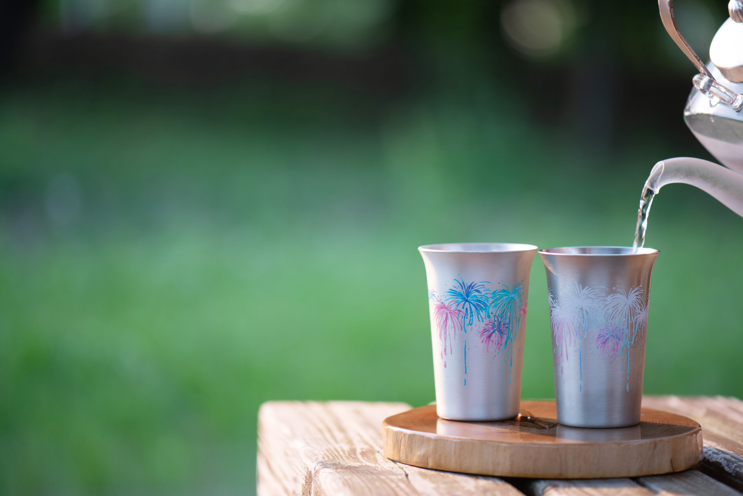 表面の柄は冷たい温度に反応して色づく仕掛けになっています。およそ16-17℃以下の冷たい液体を入れると、花はまるで咲き誇るように、花火はまるで打ちあがるように色づきます。お酒を注いで、色づく変化を目で見て楽しみながらお酒を味わえる、新しい酒器です。