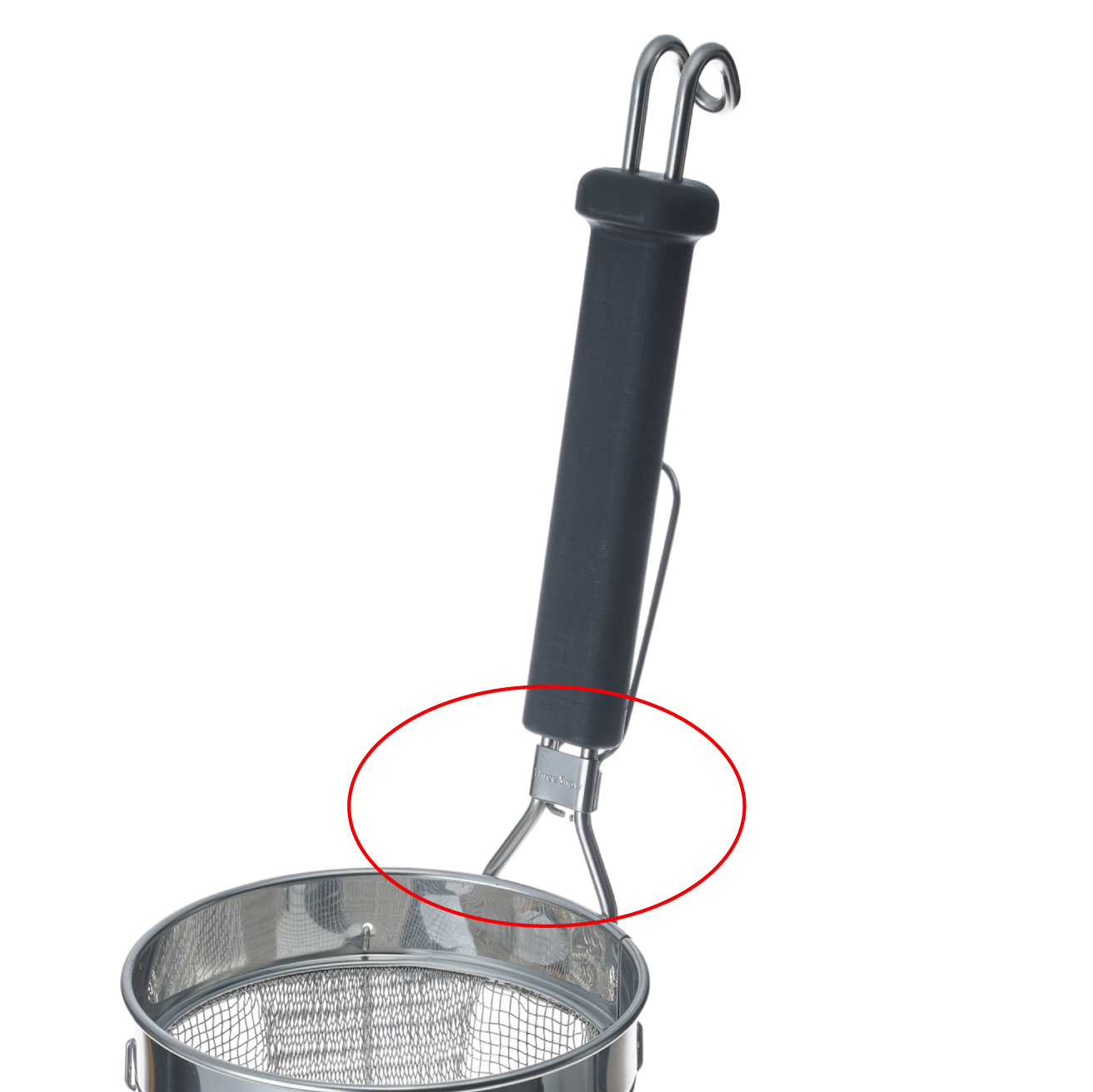 日々の湯切り動作の中で負担のかかるのが、柄の付け根部分。この部分は一般的なてぼに用いられるワイヤーの太さ(3.5mm程度)に比べ、2倍の強度を持つ(5mm)線を使用することで、抜群の耐久性を実現しまし。(一般的なてぼの4倍の耐久性)