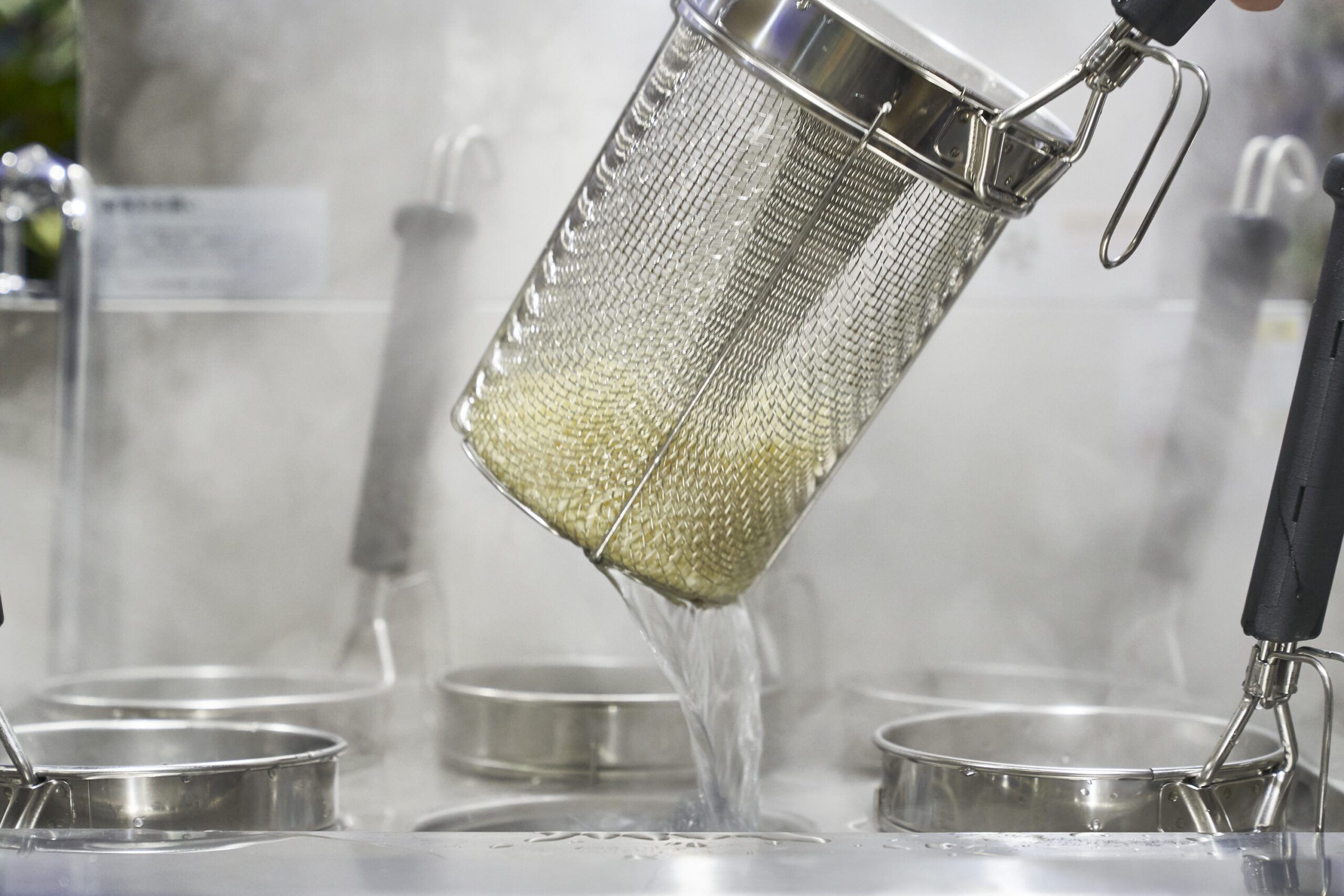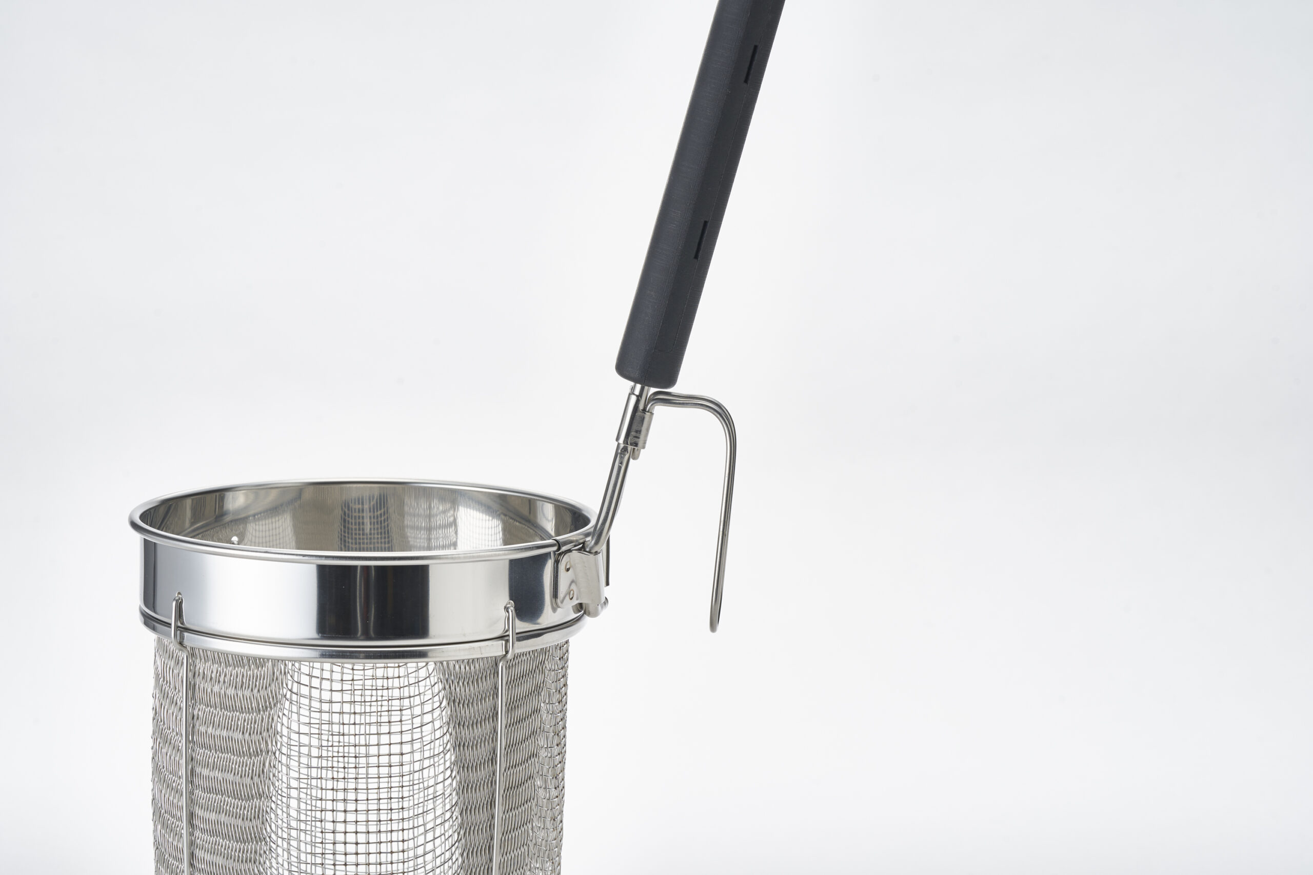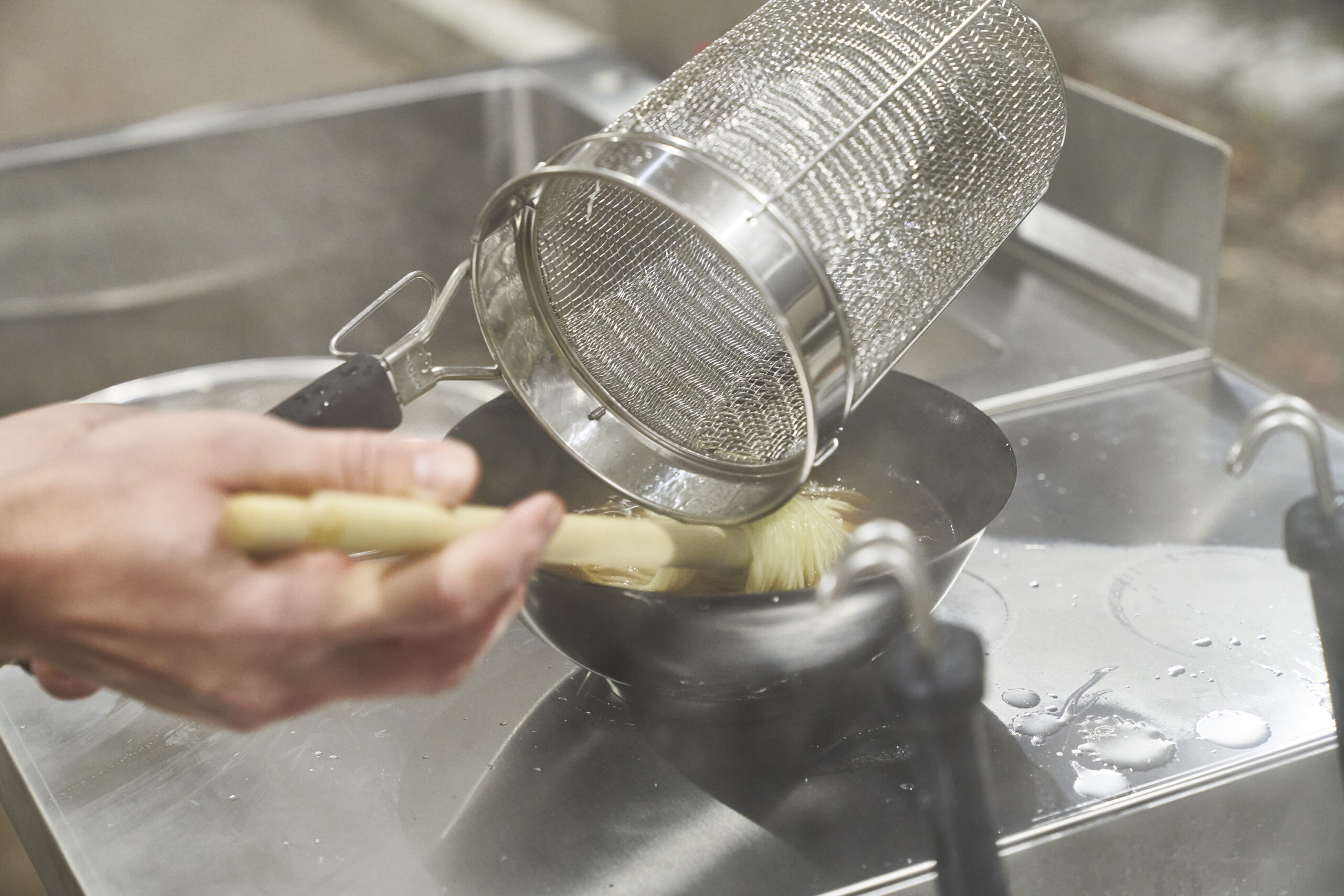 てぼのオペレーションでネックなのは麺の対流。限られたザルのスペースで麺が回らないというお悩みを抱えていませんか?「旋流(せんりゅう)」てぼはバスケットが深く、寸胴型であるため麺が踊る容積を最大限に広げています。