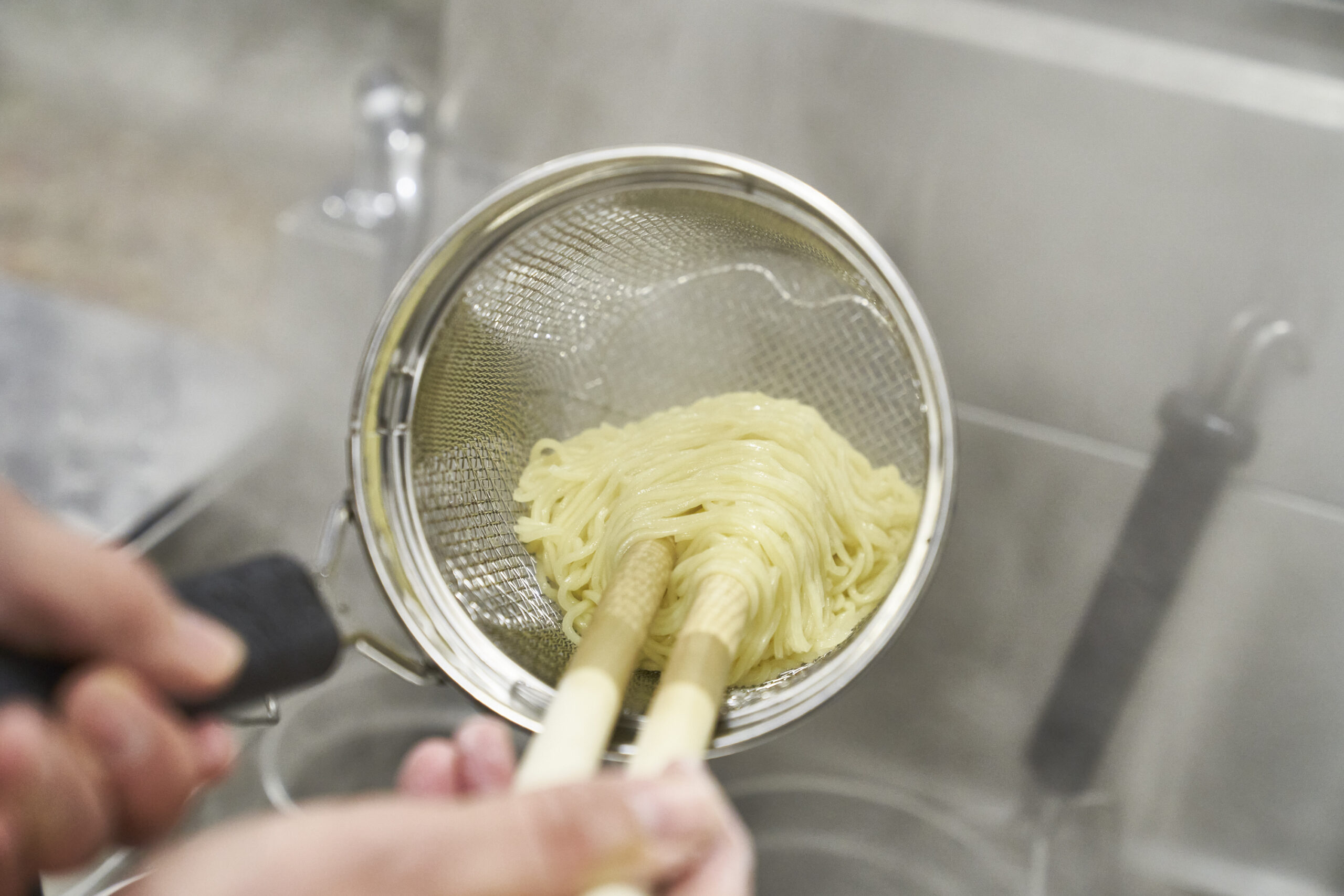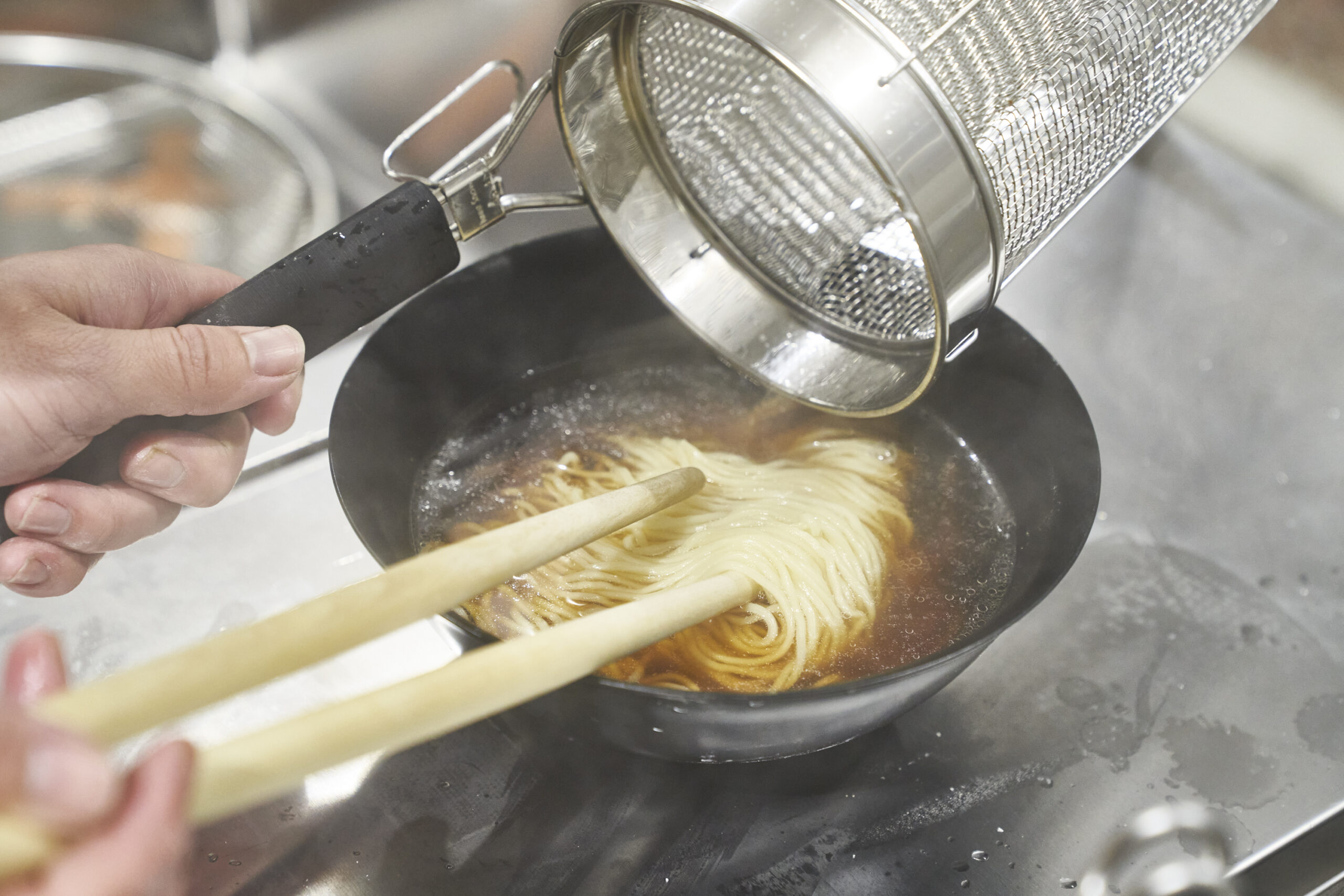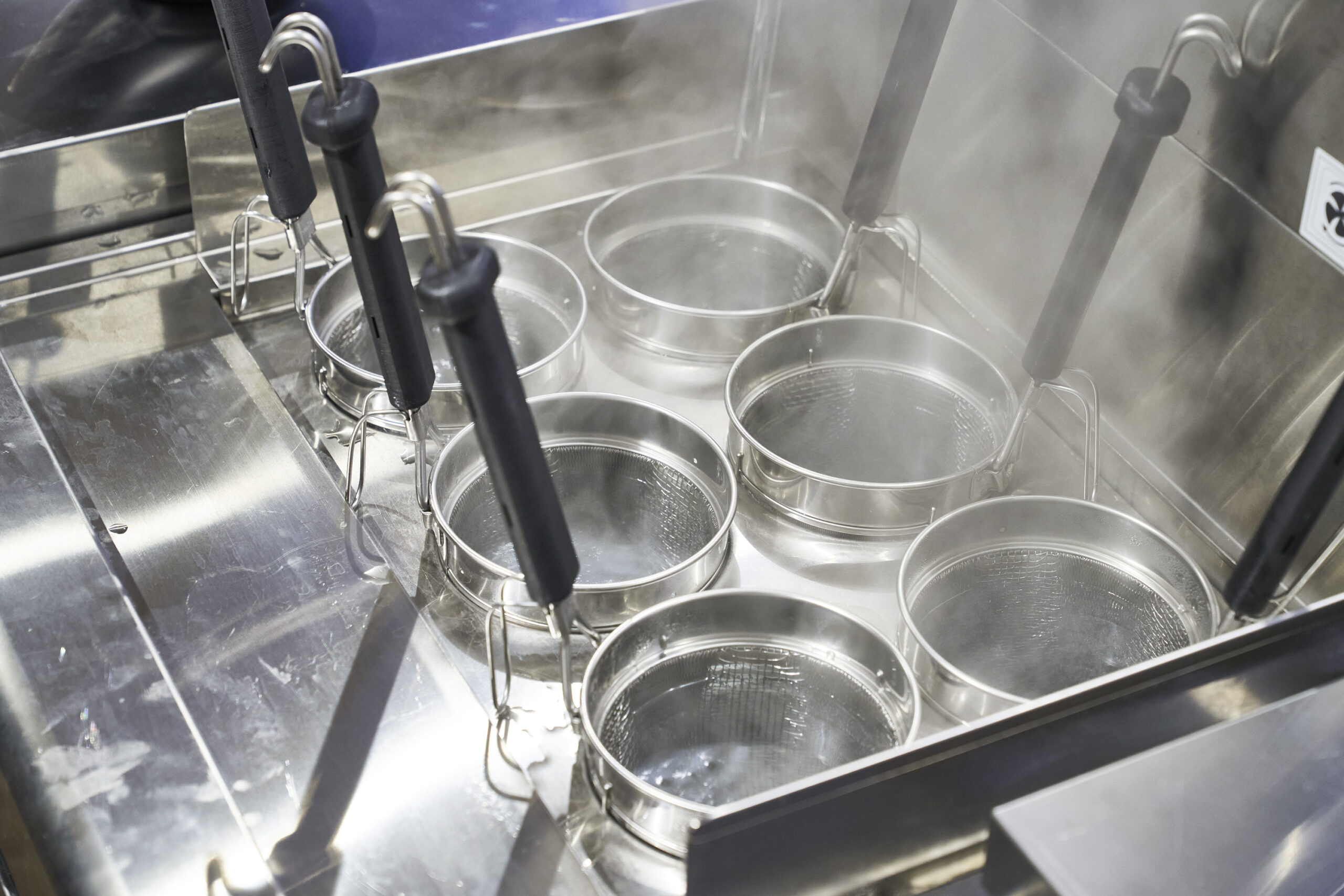 てぼのオペレーションでネックなのは麺の対流。限られたザルのスペースで麺が回らないというお悩みを抱えていませんか?「旋流(せんりゅう)」てぼはバスケットが深く、寸胴型であるため麺が踊る容積を最大限に広げています。