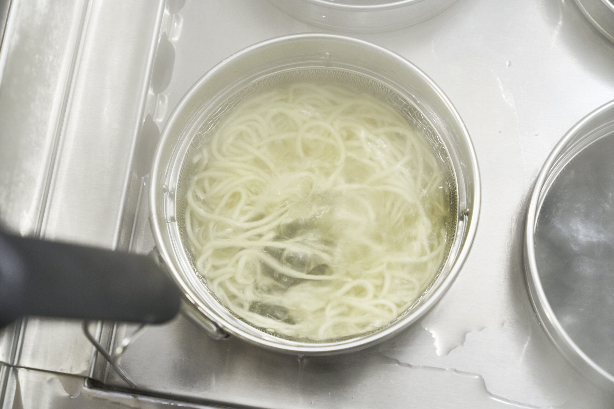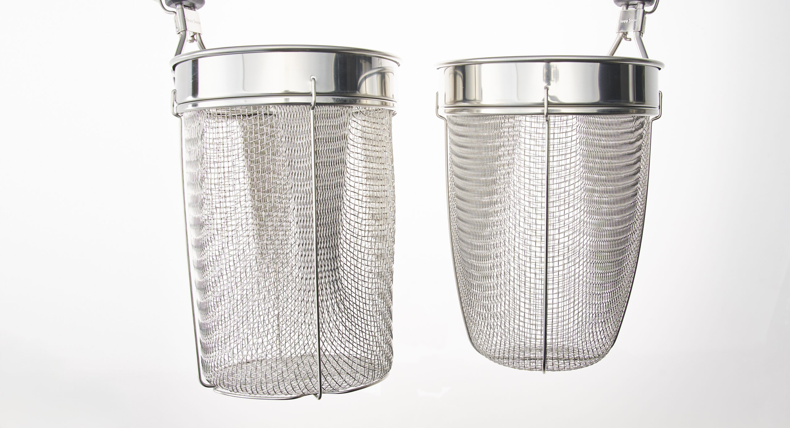太麺で重量がある麺や、大盛り(=1玉以上)を茹でる場合には、「バスケットの空間が広くあること」がうまく茹でる条件。この「旋流」てぼは通常の茹で麺機で使えるφ140mm径のサイズでありながら網を深絞りすることで、縦方向の空間を広くとっています。縦方向への深絞りは技術的に難しく、構造的に金網の重なり部分が作られやすいです。金網の重なり部分は汚れの蓄積、網線破れなどにつながりやすい傾向にありますが、スリースノーでは金網の重なり部分を作らない特殊な技術によりこの課題をクリアしています。