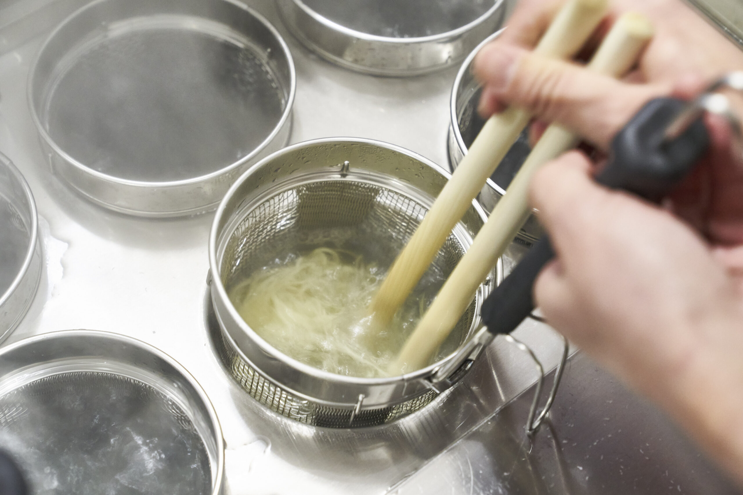 麺線をつくるオペレーションを手早く簡単に、そして綺麗に揃えるという課題は多くの方にとって大きな関心事になっていることでしょう。麺線を揃える作業には麺箸に麺を巻きつける工程がありますが、この工程はバスケットの「広さ」が作業のしやすさに直結します。